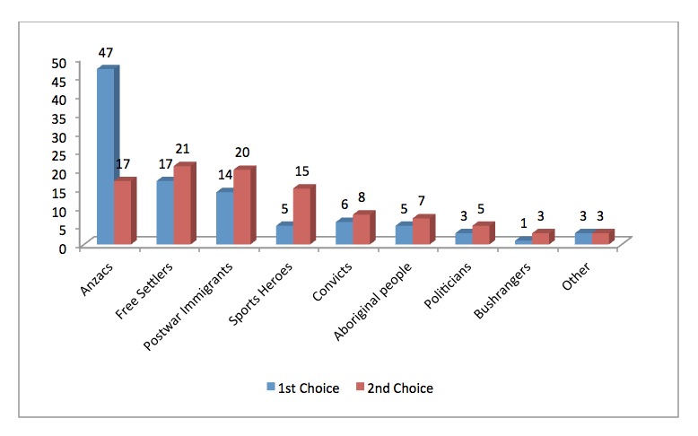 Figure 1 – Source: Australian Survey of Social Attitudes (2011): ‘Many people throughout Australia’s history have influenced the way Australians see themselves in terms of their identity as Australians. If you had to choose among the following, which would be your first choice as the most influential? Which would be your second choice?’