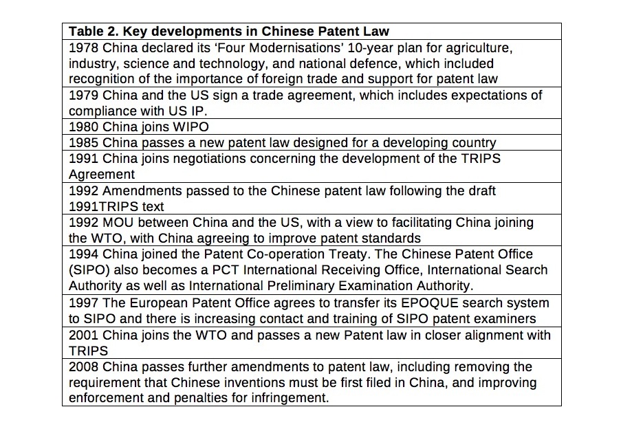 In 1995, WIPO signed an agreement with the WTO agreeing to provide technical assistance to transitional and developing countries to help improve the administration of rights and frameworks for making new laws operational (Drahos 2010, p.264). China has taken up these opportunities with WIPO, the European Patent Office (EPO), and foreign universities, and by entering MOUs with many others to facilitate SIPO’s ‘capacity-building’, providing access to training, international databases, and patent documentation. There are also trilateral policy dialogues between SIPO, the Japanese Patent Office, and the Korean IP Office, which involve co-operation in automation of systems. SIPO has also built specialized databases of relevant technological information beyond patents for a large range of enterprises, including the Haier Group, Military Medicine and Science Institution, Chunlan, Jinling, etc. Drahos argues that “SIPO has grown rapidly for the simple reason that the government sees patents as part of its overall strategy of economic growth through trade” (2010, p.231).